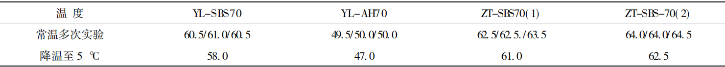 在其他條件不變時,改變升溫速率,測定瀝青軟化點2.3加熱介質是否降溫至5℃對軟化點測定的影響 加熱介質常溫下開始實驗,及降溫至5實驗測定結果見表2。由表2可以看出,如果不降溫至5℃開始實驗,測定的軟化點偏高。 瀝青軟化點的試驗方法條件性強,影響軟化點測定的因素很多,為確保試驗結果的準確性,必須嚴格執(zhí)行試驗方法,不得偏離試驗方法。